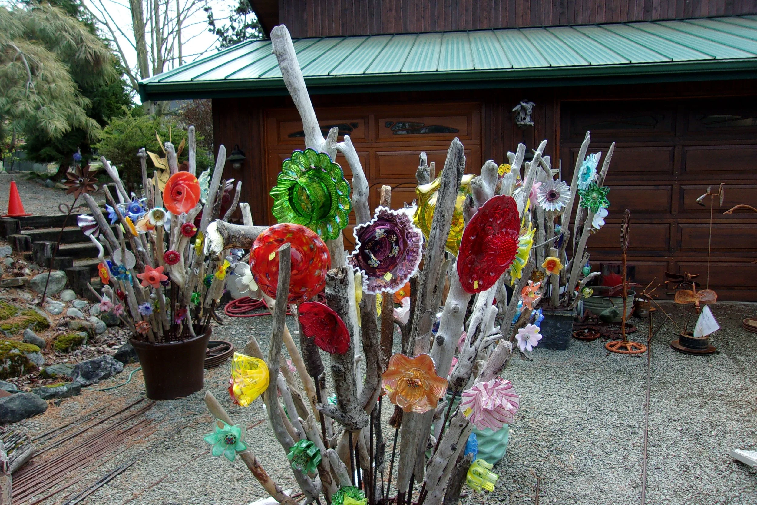 Our art is primarily made from Recycled and forged materials. Carol’s flowers are made from recycled (found) Glass attached to Driftwood to create unique designs. Steve makes eclectic often whimsical sculptures, trellises, and other garden accessories from recycled and forged metal.